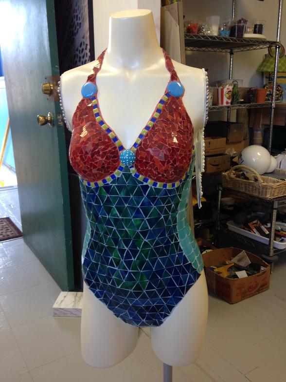 My name is Mike Murphy and I’m a mosaic artist. I work using stained glass, clear glass, glass beads and found objects. Glass presents a wider spectrum of vibrant colors and unusual shapes. I enjoy re-purposing these pieces into something new and exciting. My initial pieces were birdhouses, wall hangings and table tops. Recently my art expanded into three dimensional mosaics when I became inspired by the female form and saw the possibilities that glass might play in reinterpreting and enhancing the ideal shape of a mannequin.